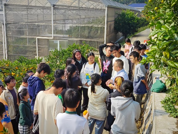 应化2022级汪婷在参观后说“这一次果园研学活动让我印象深刻,柑橘选育是一项漫长而艰辛的科研工作,它往往需要历经数年的耐心等待与不懈努力。从最初的种质资源收集,到杂交育种、后代筛选,再到最终优良品种的培育与推广,每一个环节都充满了未知与艰辛。在学长的悉心讲解下,我了解到了化学知识如何巧妙地应用于果树生长,从土壤改良到病虫害防治,处处体现着学科交叉的魅力。在乡村振兴这一宏伟蓝图的引领下,这次体验让我更加期待能够结合自己的专业知识,助力柑橘选育的发展。”