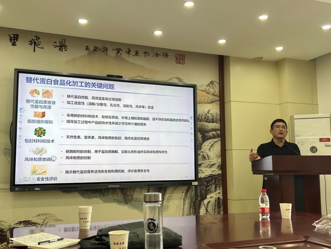 随后,食品科学技术学院李晶教授围绕《替代蛋白食品化的探索和思考》这一主题作了一场精彩的报告。他强调指出,大力发展替代蛋白食品化,不仅是对习近平总书记“大食物观”的积极贯彻落实,更是关乎民生质量提升的重大举措,能够助力实现从“吃得饱”到“吃得好”的关键跨越。李晶教授从替代蛋白的种类、研究现状、技术瓶颈以及未来发展方向等多个维度,系统深入地剖析了替代蛋白如何重塑未来饮食图景,并详细阐释了其从实验室走向餐桌过程中的“化学密码”。此外,他还结合团队在食品大分子组装以及昆虫蛋白资源开发等前沿领域的研究成果,特别介绍了“化学-食品工程”交叉技术在提升黑水虻蛋白可食用化率、降低致敏因子等方面的潜在价值和重要意义,为后续合作锚定技术坐标。