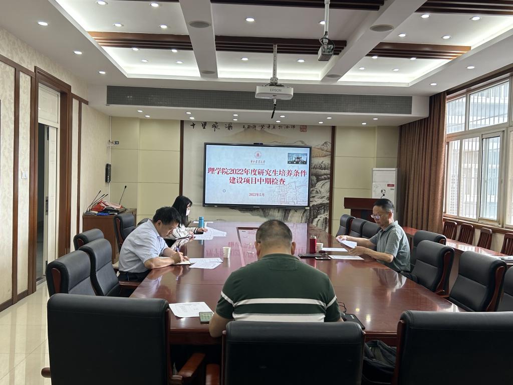 (通讯员 廖英飞)5月17日上午,理学院在逸夫楼B212会议室开展理学院2022年研究生培养条件建设项目中期检查工作,理学院教学指导委员会成员石峰、梁建功、陈建军、董旺远、魏薇担任评委。检查工作会议由理学院副院长沈婧芳主持。