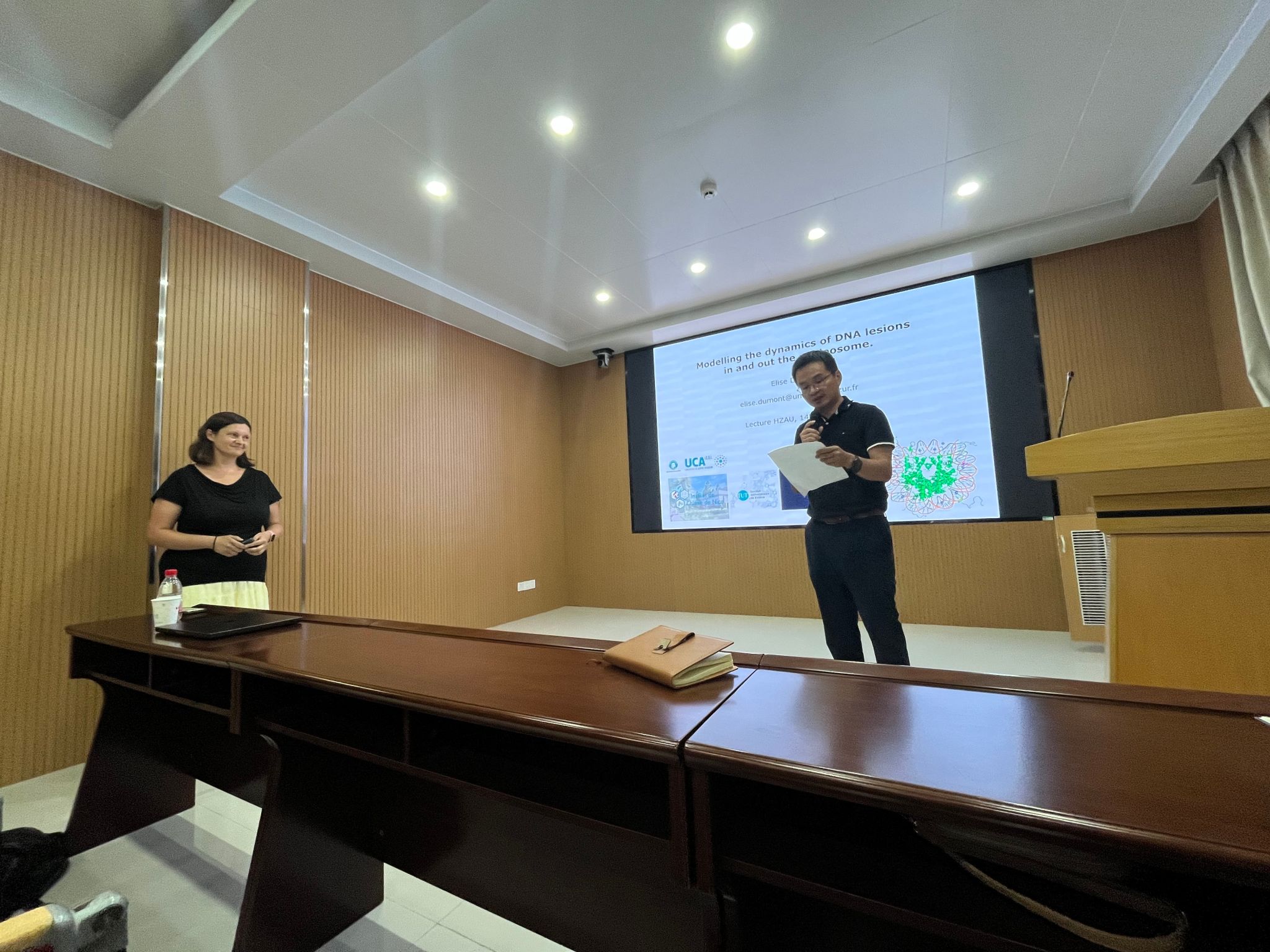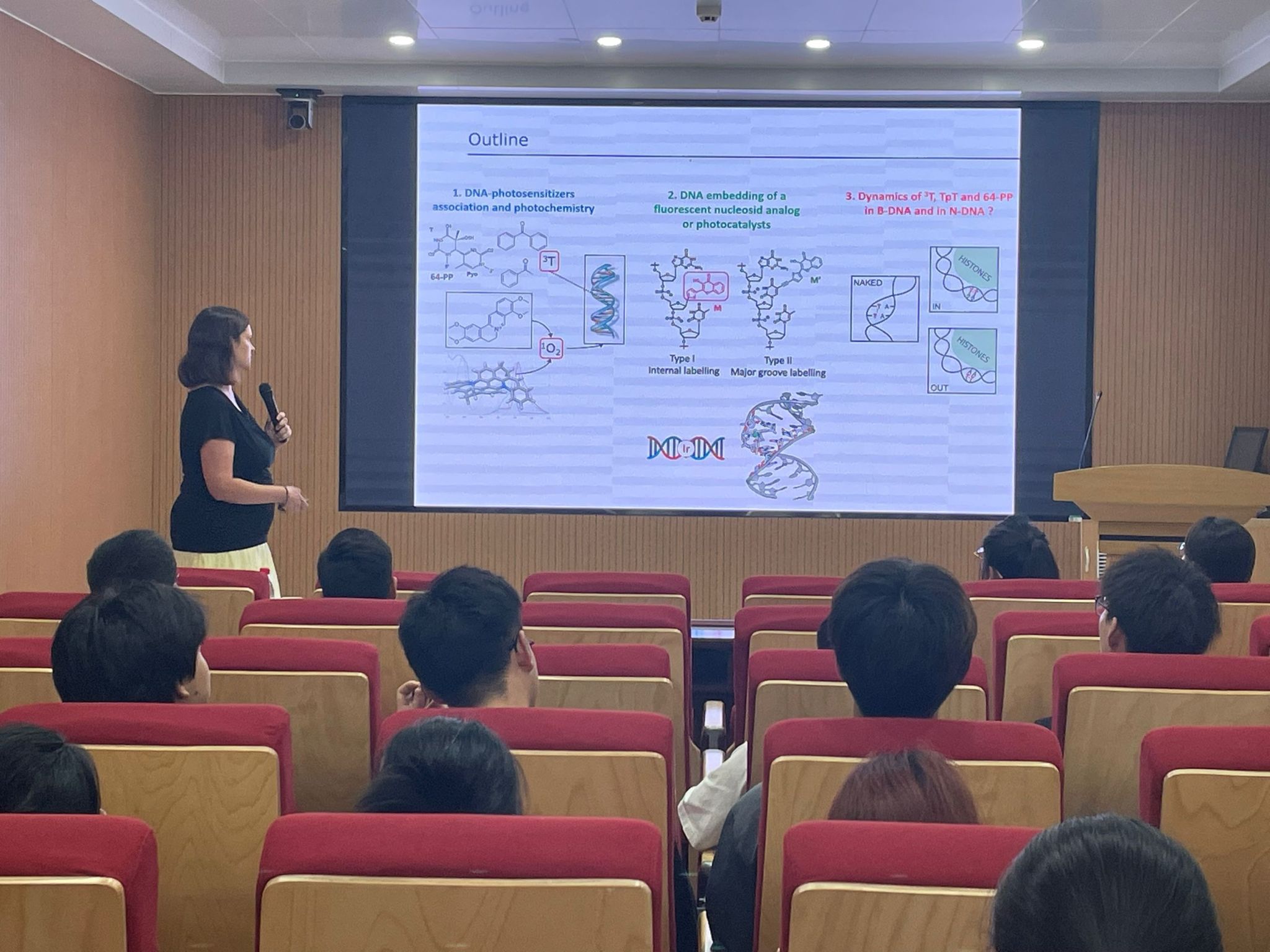 报告中,Elise Dumont教授以“核小体中DNA损伤动态”为核心主题,系统介绍了其团队在 DNA 光化学损伤机制、激发态动力学及核小体环境影响等方面的研究成果。针对 DNA 光损伤,Dumont 教授重点解析了环丁烷二聚体(CPD)和 6-4 光产物(64-PP)的形成机制与动态行为,通过微秒级分子动力学模拟揭示了其构象变化的序列依赖性。同时,她也介绍了团队开发的 REST2 加速模拟方法,通过多副本温度模拟捕捉到与 DNA 修复相关的关键构象,为理解损伤修复机制提供了重要依据。
