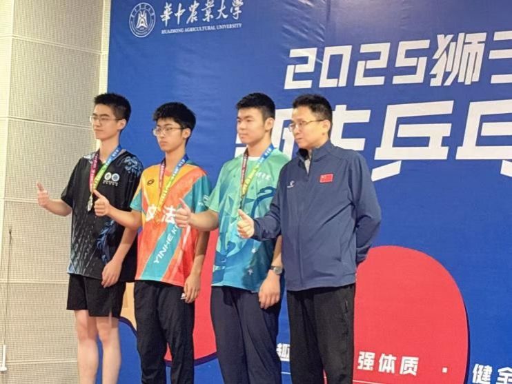 男子团体展现出良好的配合意识。队伍由周韦杭、闵俊强、周晟担任主力,研究生王宇尧作为替补全程参与。赛前,王宇尧主动分享经验,协助队友备战;比赛中,他在场边提供支持和提醒。作为主力,周韦杭在单打中多次拿下关键分;闵俊强和周晟在双打中配合默契,表现沉稳。全队从小组赛一路晋级,即使在落后时也未松懈,始终相互鼓励、积极调整。最终,麻豆
