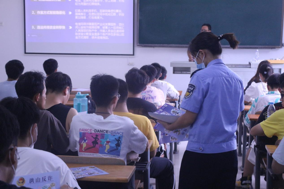 讲座开始后,民警通过发放宣传材料、现场讲解等方式,提醒同学不轻信来历不明的电话和信息,不向陌生人透露自己及家人的身份信息、存款、银行账号等重要信息。并且列举了几种常见的诈骗类型,一是冒充朋友或家人向自己发短信、打语音电话,拜托“紧急”汇款,然而未见其人,结果被骗;二是通过刷单,开始会给予小份额的收款到账,获得信任后一步步引诱同学转钱,最终得不偿失;三是网络购物时诈骗团伙冒充客服,以货物出现问题为由,发来不明链接,向手机中植入病毒等等。