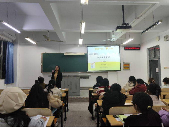 在女生健康管理方面,王老师讲述了多种慢性病的发生、发展、症状及预防,提醒同学们感受身体的信号,反思原因,从生活习惯入手,给身体时间和原材料,帮助身体自我修复。其次,针对女生青春期发育特点,提醒同学们适量运动,少熬夜,注重营养均衡,避免单一饮食,少外卖、少油炸、少饮料等,为自己的现在和未来储备健康。最后,王老师通过文献数据告诉大家三大能量物质在三餐中的占比,每天应该吃多少,做到会算会吃、心中有数的吃,为细胞健康而吃而非口腹之欲的吃。