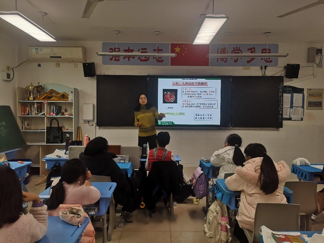 接着王老师通过小活动让同学们体会心脏的工作状态。她让大家攥紧拳头再松开,1分钟完成70次,不到15秒,下面累声一片。王老师告诉大家,这就是我们的心脏——最能干的器官,在妈妈肚子里就开始跳动,每天收缩舒张10万多次,一刻不能休息,只为守护我们的生命。我们的心脏这么勤奋、拼命,我们凭什么不好好爱她呢!
