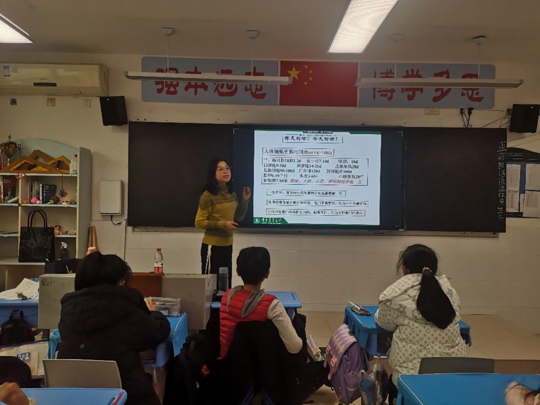 随后,王老师又从细胞讲起。“人体60万亿的细胞不断更新:皮肤晒黑,过一段时间又变白;口腔长溃疡,过几天就好;肝脏更加神奇,是唯一可以再生的器官,切掉1/3,3-6月后还可以长出来等等。”听到此,同学们惊呼一片。王老师让大家认真感受细胞的浪漫,她们不断更新,只为一个全新的你。“所以当太阳升起,我们要愉快地拥抱今天,伴着美好的心情起床,认真吃早饭,开心上学、专心听课、痛快玩耍,只为不辜负自己细胞的爱。”王老师强调,细胞允许我们有犯错的权力,也给了我们改错的机会和能力,但我们不能总对她犯错,只犯错不改错,细胞最终会罢工。
