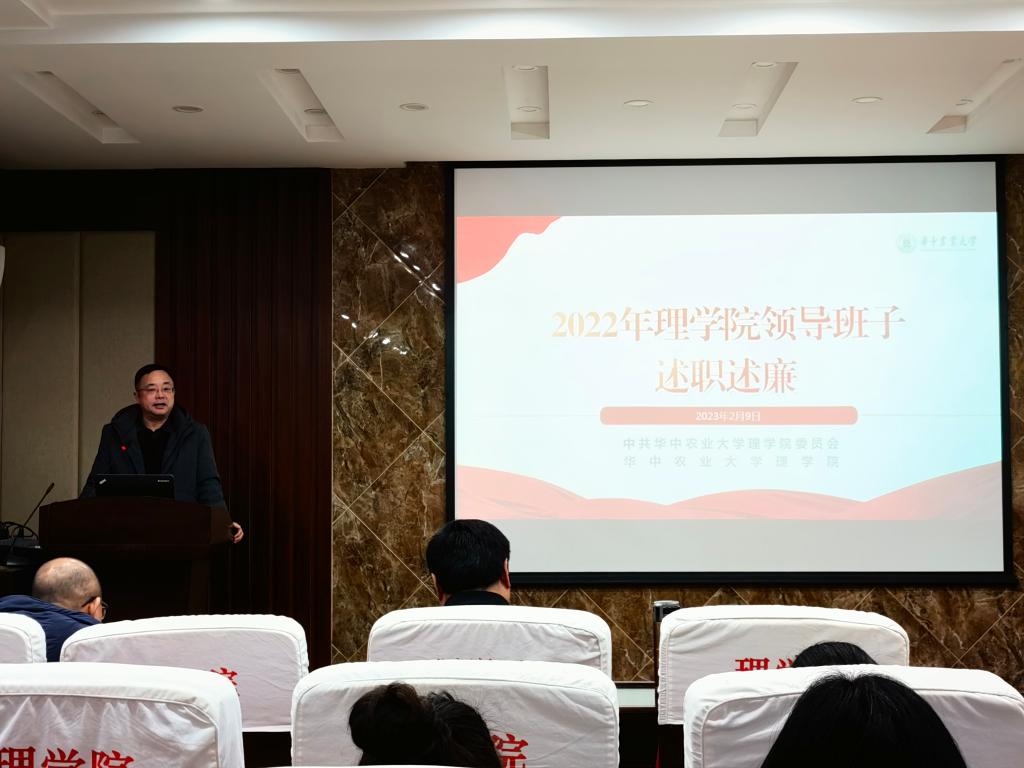 涂俊才首先代表学院领导班子进行述职汇报。他以“凝心聚力,党建引领发展”“锐意进取,创新推进发展”“培育品牌,支撑教师发展”“用心用情,建设美丽理学”“一刻不停,全面从严治党”为主线,汇报了领导班子坚持党的全面领导,强化创新理论武装,落实2022年年度工作目标,科学决策、依法管理、改革创新、锐意进取,在党的建设、人才培养、科学研究、社会服务、学科建设、人才引育、国际交流合作、校园文化建设、师德师风建设、党风廉政建设和作风建设等方面取得的成绩和效果。2022年,领导班子坚持以习近平新时代中国特色社会主义思想为指导,贯彻落实学校党委决策部署,落实立德树人根本任务,坚持党建引领事业高质量发展,坚持教学立院、科研兴院、人才强院,不断提升学院治理能力和水平,为建设特色鲜明世界一流大学作出了理学贡献。