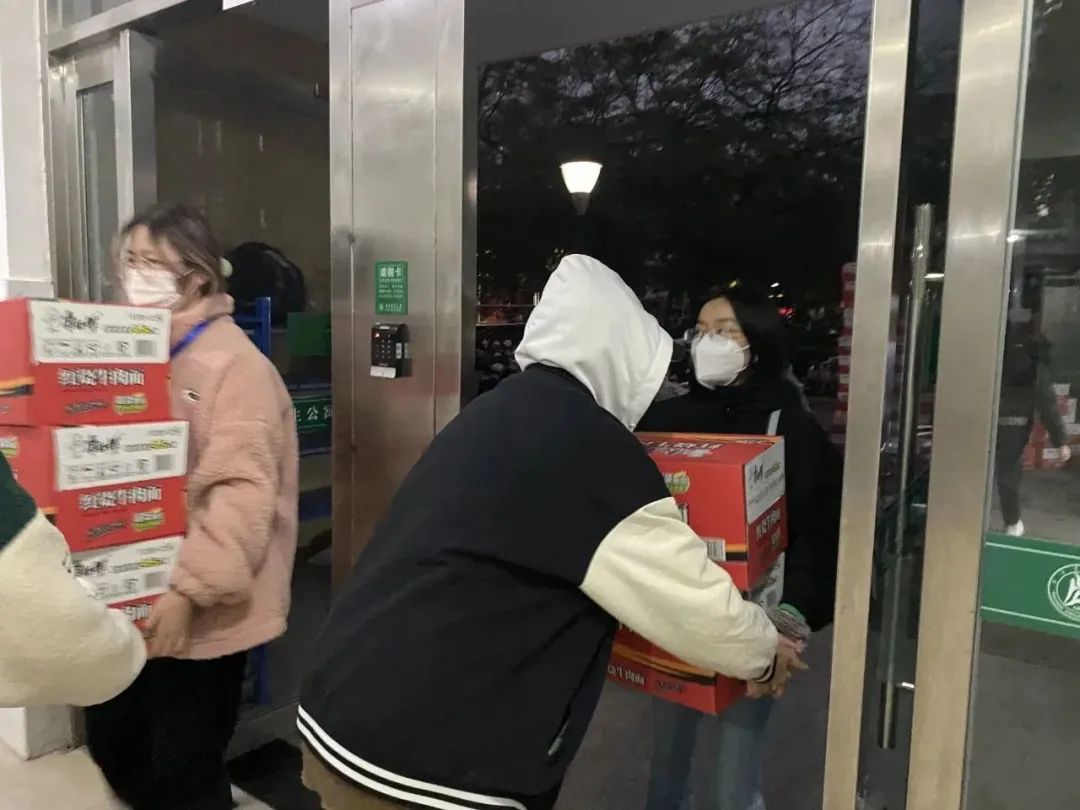夜晚,当晚饭分发完后,他们依然没有停下休息,而是为同学们分发各种必要物资,他们戴着口罩,呼吸沉重,但是步履坚定。经过多天的合作,老师同学们已经非常默契,一个人从另一个人手中接过这份沉甸甸的爱,再传递给下一个人。