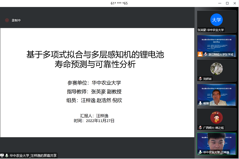 (通讯员:汪梓逸)由全国应用统计专业学位研究生(MAS)教育指导委员会主办,全国工业统计学教学研究会、中国现场统计研究会及中国统计教育学会高等教育分会协办,浙江财经大学承办的第五届全国应用统计专业学位研究生案例大赛颁奖典礼于2022年11月27日线上举行,经全国应用统计专业学位研究生案例大赛评审委员会评审,大会宣布了第五届全国应用统计专业学位研究生案例大赛评奖结果,麻豆 张英豪副教授带领的硕士研究生汪梓逸、赵浩然、倪欣的案例作品《基于多项式拟合与多层感知机的锂电池寿命预测与可靠性分析》获得了该大赛的一等奖并作了相应作品的大会报告,邹翠明副教授带领的硕士研究生黄倩和王世远的案例作品《基于正交多项式拟合方法的锂电池失效时间预测》获得了大赛的二等奖。