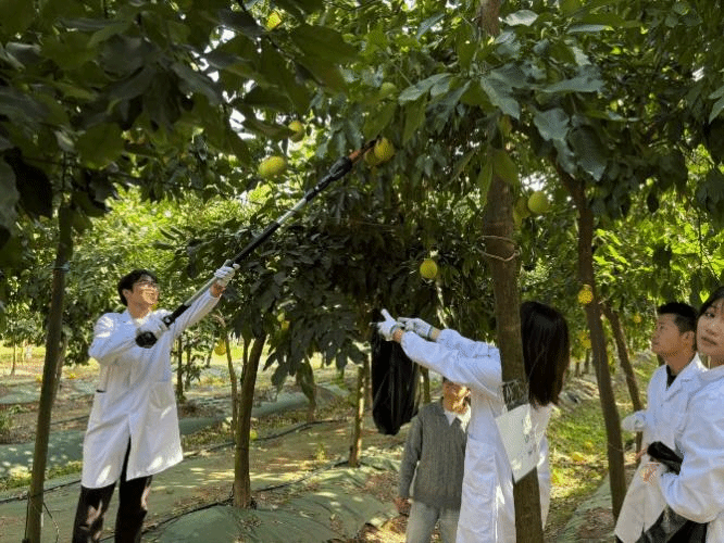 活动伊始,园艺林学学院研究员徐远涛老师为同学们进行了细致的现场指导。徐老师首先向大家介绍了柑橘科研基地的基本情况,并简要分享了基地在柑橘、橙子、柠檬、柚子等水果新品种培育方面的创新研究成果,让同学们对眼前的果园有了全新的科学认知。随后,他重点讲解了科研实验中规范科研样品采集、科学分类与安全包装等关键环节的操作要点与技术规程,使同学们深刻体会到科学研究严谨求实的精神。