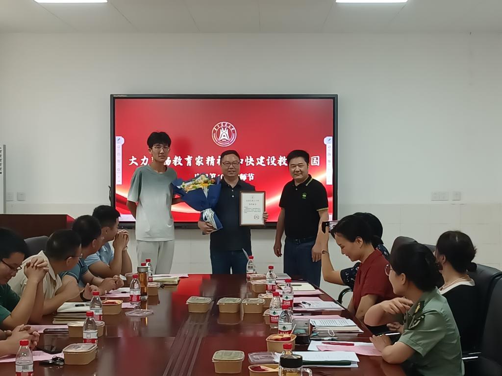 致敬光荣从教30年教师,肖志东老师深情回忆了自己从教三十年的缘起和历程。他跟青年教师重点谈了二点体会:一是教师已经成为天底下最荣光的职业,传道授业解惑,与青春作伴,见证大学生的进步和成长;二是教师要心中有光,做好发光照耀学生的引路人,让学生了解自己,认识自己,健康快乐成长,增长才干,收获幸福人生。学院党委书记涂俊才为肖老师颁发了光荣从教30年荣誉证书,向奋斗在教育工作战线上的老师表达了最崇高的敬意。