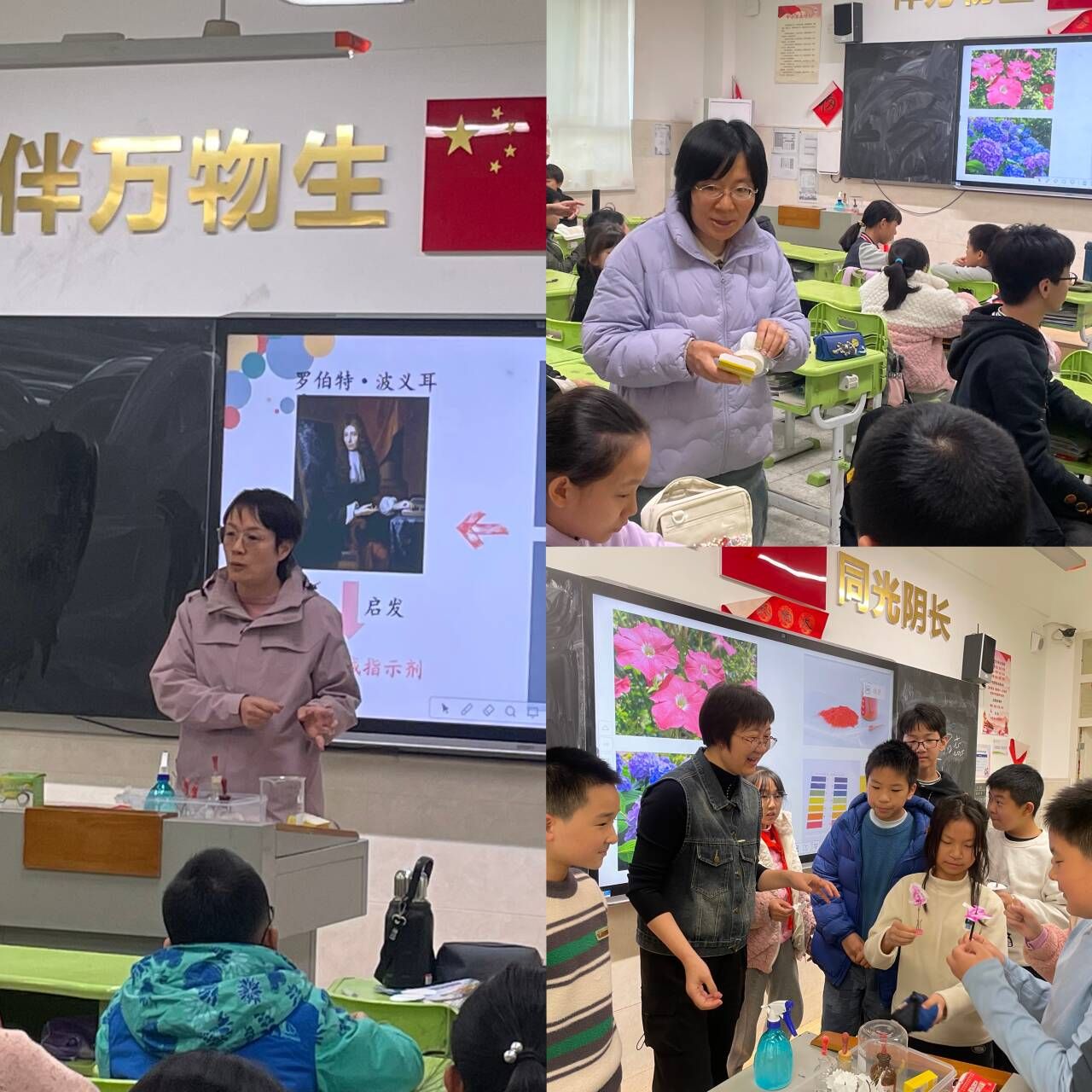 活动伊始,老师们讲述了罗伯特·波义耳的故事,这位被誉为现代化学之父的17世纪英国科学家,以其发明的酸碱指示剂而闻名。他从紫罗兰遇酸变色的现象思考探索,揭示了植物颜色的奥秘,进而发明了酸碱指示剂。老师们巧妙地将化学知识与自然现象相结合,让孩子们在探索中学习,在体验中成长。