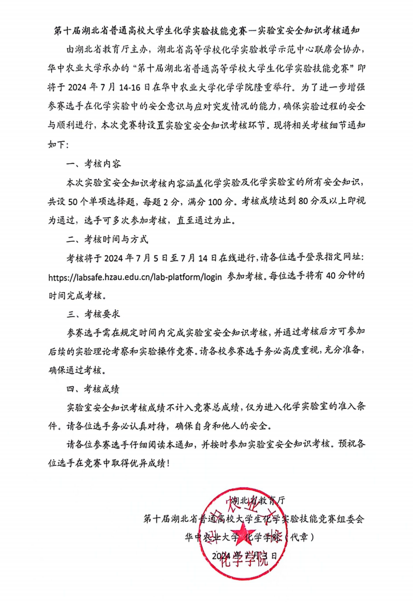 第十届湖北省普通高校大学生化学实验技能竞赛—实验室安全知识考核通知