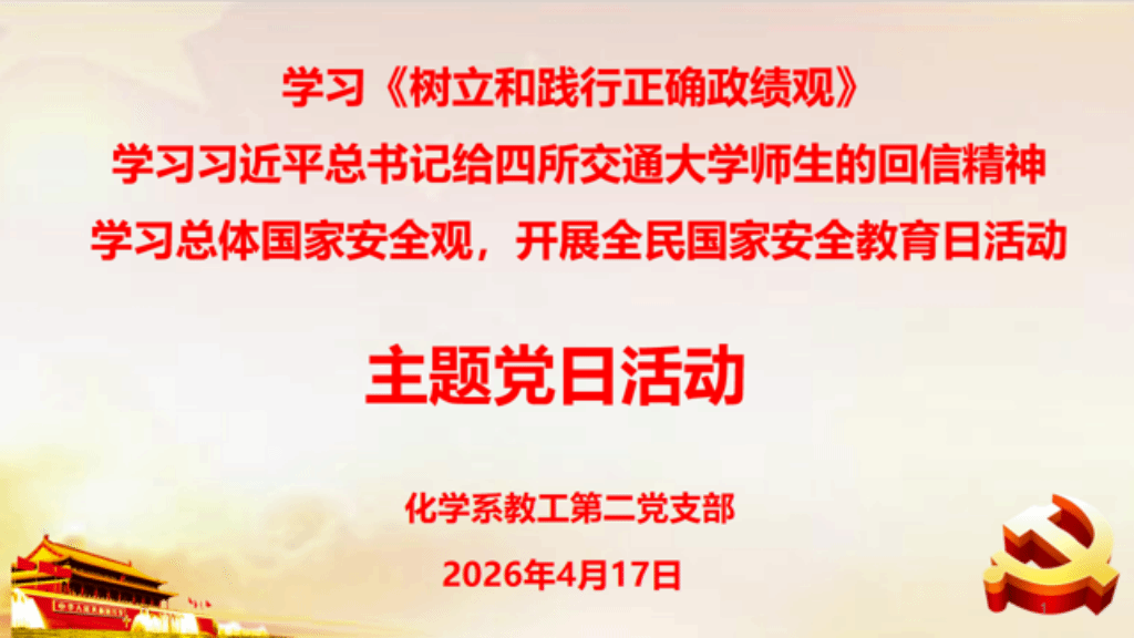 (通讯员:薛爱芳)2026年4月17日下午,化学系教工第二党支部在化学楼A106会议室组织开展4月份主题党日活动。支部党员及教研室非党员教师参加学习活动。党支部书记梁建功主持会议。