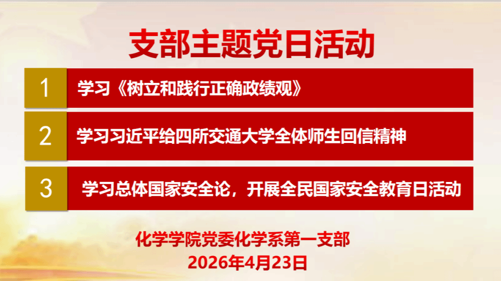 (通讯员:丁聪)2026年4月23日下午,化学系教工第一党支部在化学楼B201会议室组织开展4月份主题党日活动。支部党员及教研室非党员教师参加学习活动。党支部书记曹敏惠主持会议。