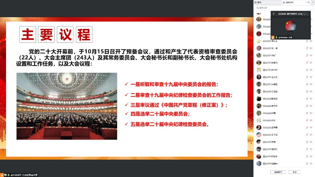 12月12日下午,青年讲师团成员孙涛同学为理学院应化2201、应化2202、应化2203、应化2204团支部同学带来“凝心聚力,走好新时代的长征路”主题宣讲。孙涛同学带领大家回顾了党的二十大报告的主要内容,学习总结了近年来中国共产党取得的伟大成就和宝贵经验,讨论和分析了中国共产党跳出治乱兴衰历史周期律的两个答案。最后,他从时代的机遇和挑战出发,与同学们互动交流,探讨青年学子应如何走好新时代的长征路。