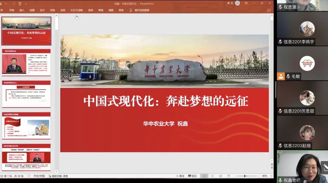 12月12日晚上,青年讲师团成员祝鑫老师为理学院信息2201、信息2202、信息2203团支部同学进行了以“中国式现代化:奔赴梦想的远征”为主题的宣讲。会议伊始,祝鑫老师向同学们提出“什么是现代化?”“什么是中国式现代化?”两个问题,结合历史背景为同学们讲解中国式现代化的产生和历程。