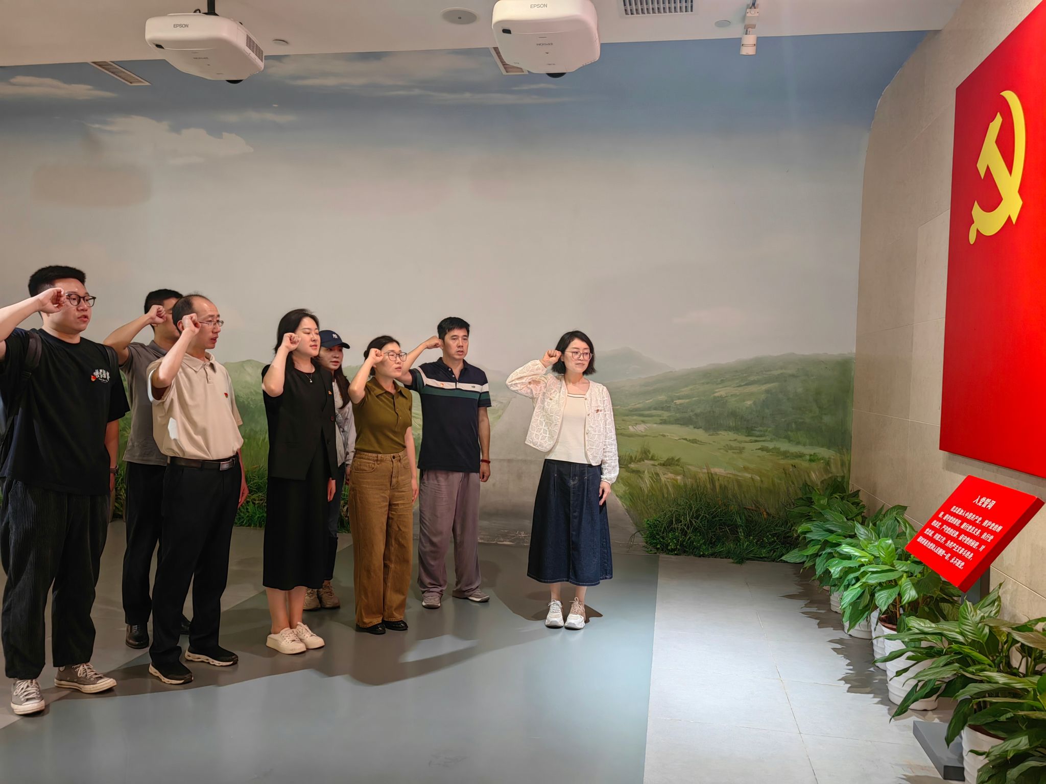 在陈列馆庄严肃穆的宣誓厅,面对鲜红的党旗,支部党员高举右拳,重温入党誓词,组织委员杨晨茹领誓“我志愿加入中国共产党……”铿锵有力的誓言在厅内回荡,字字千钧,激荡着每一位党员的心魄。