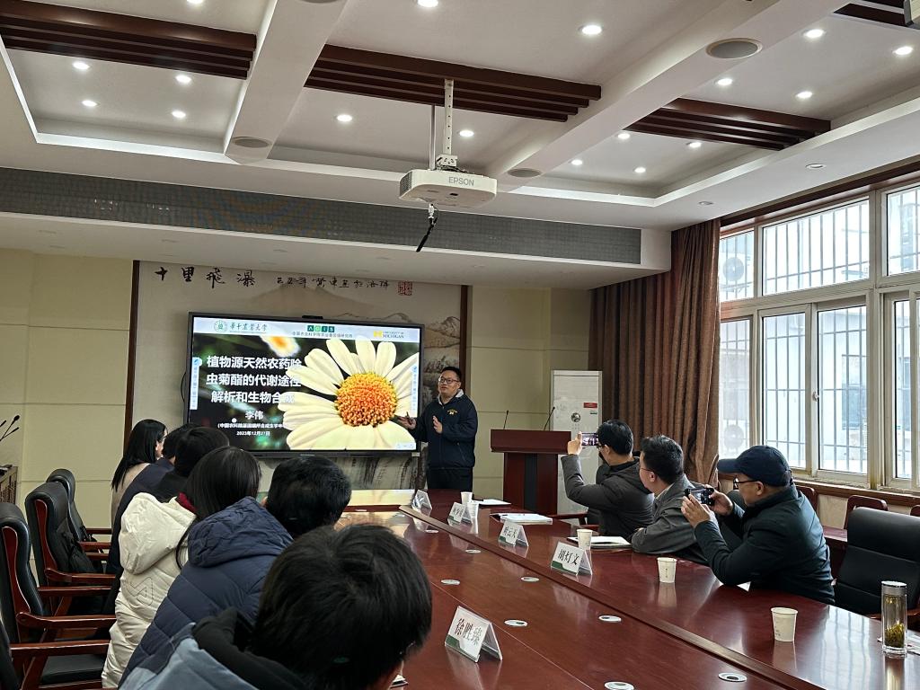 研讨会第一环节,由中国农业科学院深圳农业基因组研究所李伟研究员作了题为《植物源天然农药除虫菊酯的代谢途径解析和生物合成》的特邀报告。李伟研究员介绍了以除虫菊酯为代表的植物源农药在生产中面临的植物资源短缺的困境。李老师的研究目的是解析除虫菊酯的代谢及生物合成途径,探索用合成生物学的方法实现除虫菊酯的生物“智”造。李老师深入浅出地向与会专家和同学们讲述了自己在研究思路,并就实验结果与专家、同学进行分享与讨论。报告结束后,同学们纷纷提问,并得到李老师的悉心解答。